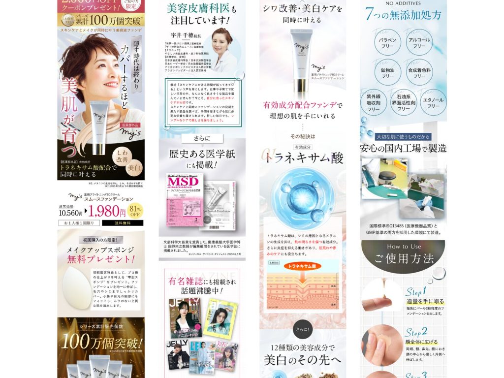 広告設計に基づき、訴求軸を整理し、それぞれに対応したLP構成を設計しました。Meta・Google広告と連携し、LP内のユーザー行動データを分析しながら訴求位置を調整することで、広告とLPの一貫性を高めました。その結果、商品世界観の伝達から購入までの導線がスムーズになり、ブランド価値を効果的に訴求できる構成を実現。あわせて、流入経路ごとのユーザー行動データが蓄積され、今後の広告クリエイティブ改善につながる基盤を構築しました。